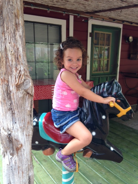 Elena has been riding this barber shop pony since she was a baby--and now here it is on the new back deck. We call it our break-up present because Mike gave it to me when we broke up seven years ago.