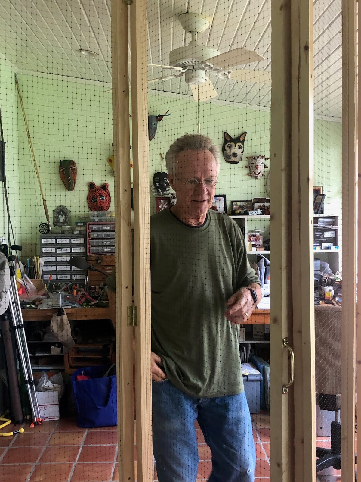 | Kent build folding screen doors to prevent splattery decoration and destruction in his study-- as the birds are free to fly all over the house. |